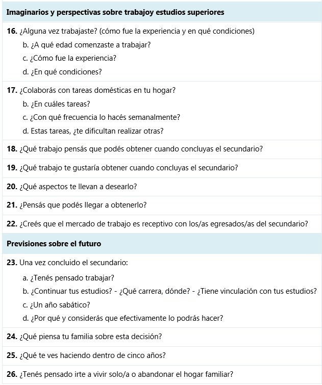 La información obtenida tras la realización de las entrevistas fue dividida en dos temáticas base: «Trayectorias escolares y laborales como itinerarios transicionales» y «Proyecciones de vida, entre individualización y soportes familiares». El abordaje de cada una se centró en la identificación de tendencias generales y de órdenes de prelación, y en la evaluación de la incidencia de las variables de género, de gestión y de modalidad educativa en la elaboración de respuestas.