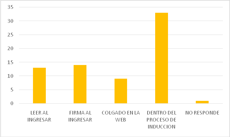 Con respecto a la segunda hipótesis acerca de la existencia de políticas escritas que demuestren su compromiso, y la comunicación, capacitación y entrenamiento a todo su personal en la importancia del Compliance, encontramos diferentes resultados. La mayoría conocía la existencia de los valores organizacionales al incorporarse a la organización; sin embargo, al consultar sobre las capacitaciones y entrenamientos, los resultados fueron poco alentadores; tampoco, según entendemos, existen actualizaciones, y, si existen, no se comunican, ya que la frecuencia es realmente baja.