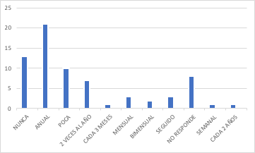En este caso la respuesta era abierta ya que no queríamos limitar ninguna posibilidad, cada uno debía responder de acuerdo con la organización. Lamentablemente, vemos que el 18% no capacita, o lo hace de manera que el personal reconoce como escasa (14%), y el 30% lo realiza anualmente. Creemos que esto es clave en el compromiso de la dirección y en cómo esto se transmite a toda la línea dentro de las organizaciones. La falta de entrenamiento representa un riesgo clave. Si no se percibe dentro de los líderes el claro involucramiento en los valores de una organización, es difícil que en las líneas inferiores pueda derramarse. Por otra parte, los entornos cambiantes requieren la actualización de los procedimientos y esto conlleva a realizar nuevas capacitaciones.