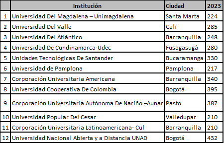 Hay que considerar que existen ofertas en subregiones que no se abren de manera constante y esto implica que aparezcan estudiantes un año en las pruebas Saber Pro, pero al otro año ya no se tengan estudiantes en ese lugar. También existen ofertas anuales y no semestrales, por lo cual algunas instituciones podrían aparecer en un año, en este tipo de datos del análisis, pero en el siguiente no.