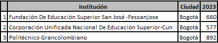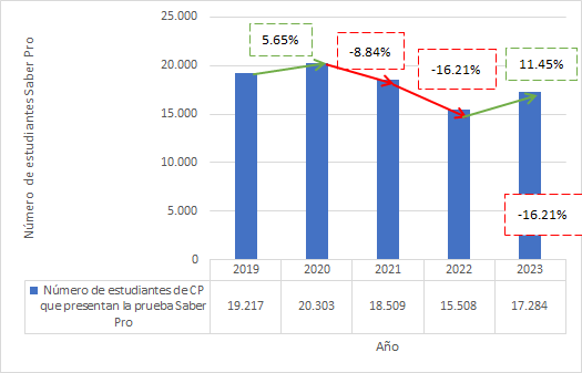 Para un primer análisis se consideraron los datos que entrega la plataforma de la revista SEMANA, en su componente económico conocido como DINERO, que toman como fuente la información que les suministra el Instituto Colombiano para la Evaluación de la Educación (ICFES) por cada programa en el país para los años 2019 y 2020. Para los años 2021 al 2023 se tomaron de la base de datos del Ministerio de Educación Nacional (MEN), particularmente, de ICFES interactivo. Este tipo de datos da una primera referencia sobre el comportamiento en incremento o decremento de estudiantes que están culminado la carrera de Contaduría Pública, pues esta prueba es de obligatorio cumplimiento para obtener el título profesional en Colombia, y, por ende, todas las IES apoyan el proceso de registro de sus estudiantes de últimos niveles para que cumplan con tal requisito.