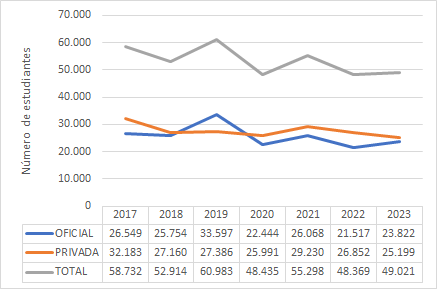 En el análisis que se desarrolla, se recogen efectos de momentos en los cuales los programas de Contaduría Pública ya aquejaban una merma en sus aspirantes a la carrera, es decir, aproximadamente desde el año 2015. Sin embargo, esto no ha sido limitante para que se abran nuevos pregrados de la disciplina en el país, muy a pesar de que también se vienen cerrando otros. Adicionalmente, es necesario considerar que en este período se han tenido paros en el país y la pandemia que ha menguado en muchos casos el desarrollo normal de los semestres académicos. Los efectos del COVID-19 y los paros1 en IES públicas pueden tener cierto grado de incidencia en algunas disminuciones de estudiantes que llegan a culminar su carrera hasta el año 2022; sin embargo, para el 2023 se nota una mejora en las cifras, con un efecto de freno para la caída global que se venía observando entre los años 2020 a 2022.