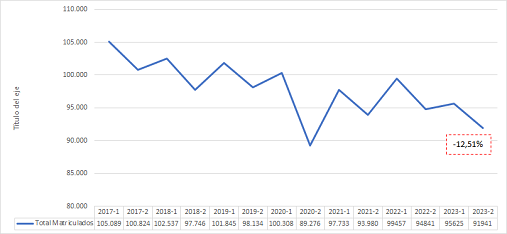 Por otro lado, con relación a los estudiantes que se encuentran matriculados en los programas de Contaduría Pública, sí se evidencia una caída del 12,51 % en el período comprendido entre 2017 y 2023 (ver Gráfico 3). Vale la pena mencionar que algunas universidades públicas han tenido inestabilidad en estos períodos y que posiblemente esto afecte la estadística debido a que, en un año, es posible que solo se desarrollara un único semestre debido a los paros. Ahora, esta disminución, aunque importante, también puede estar asociada con un menor número de estudiantes que está ingresando a las carreras universitarias, pues encuentran en los cursos y técnicas de corta duración opciones de formación diferentes con alta empleabilidad, por lo cual, están descartando el ingreso a una carrera de cuatro o cinco años.