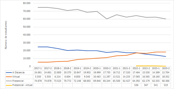 En segundo lugar, SNIES (Sistema Nacional de Información de la Educación Superior), en el período comprendido entre 2017 y 2023. Tales datos presentan de manera directa los comportamientos de inscritos y matriculados, y permiten su desagregación por IES públicas y privadas y según la modalidad de oferta del programa (virtual, presencial, a distancia o combinada).