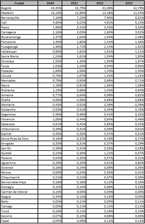 En la Tabla 1 se observa cómo, en el año 2020, Bogotá concentra cerca del 44 % de estudiantes de la prueba, seguido por Medellín con un 15 %, Barranquilla con un 7 % y Cali con un 5 %, las cuales constituyen las ciudades donde mayoritariamente se forma a los contadores públicos y las contadoras públicas del país con un poco más de un 70 % de los aspirantes, lo que concuerda con las 4 ciudades más grandes del país en términos poblacionales. Mientras tanto, para el año 2021, Bogotá mantiene casi el 44 % de los estudiantes, Medellín pasa a un 13 %, Barranquilla nuevamente presenta un 7 % y Cali el 5 %, manteniendo relativamente estable la proporción de estudiantes de contaduría pública concentrados en estas cuatro ciudades capitales. Para el año 2022, Bogotá disminuye un poco su participación hasta el 41 %, Medellín conserva un 13 %, Barranquilla logra acercarse al 8 %, y Cali continúa próximo del 5 %. Mientras tanto, para el año 2023, Bogotá recupera un poco su porcentaje llegando cerca del 43 %, Medellín baja más de un punto porcentual hasta aproximadamente el 12 % y Barranquilla sigue ganando terreno aumentando hasta el 9 %. Además, se destaca el incremento de Cartagena hasta un 3,5 %.
