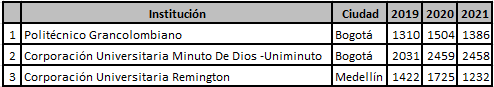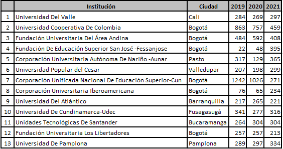 Un reciente estudio de Sánchez Becerra y Velasco Burgos (2023) presentó un análisis desde la oferta de programas de Contaduría Pública a partir de los datos reportados a SNIES para el período 2021-2. Allí encontraron que, para ese período, existían 254 programas activos, de los cuales, el 22,5 % eran de IES públicas y el 77,5 % de IES privadas. Además, llama la atención que al desagregar los datos por IES, algunas de estas contaban con gran volumen de matriculados como la Corporación Universitaria Minuto de Dios, la Corporación Universitaria Remington, la UNAD (Universidad Nacional Abierta y a Distancia), el Politécnico Grancolombiano y la Universidad Cooperativa de Colombia, que, en suma, alcanzaban el 30,9 % de estudiantes matriculados, lo que condensa en cinco IES una gran proporción de los estudiantes de esta carrera universitaria, y evidentemente, al concentrar el mercado, dejan fuera de carrera a otras IES, que por distintas razones, no logran acopiar estos volúmenes de matrícula.