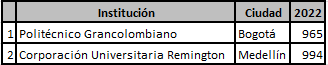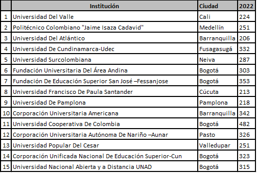 Para el año 2022, se observan cambios importantes en esta distribución, pues las universidades que poseían más de 1.000 estudiantes inscritos para Saber Pro pasan de tres a solo una, pero también se incrementan las universidades que tienen entre 200 a 500 estudiantes, pasando de 13 a 15. Este hecho deja en evidencia cómo se empieza a desconcentrar el mercado de algunas de las IES para pasar a dar el protagonismo a unas nuevas (ver Tablas 4 a 6).