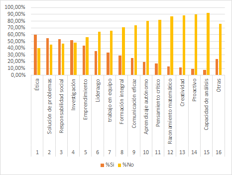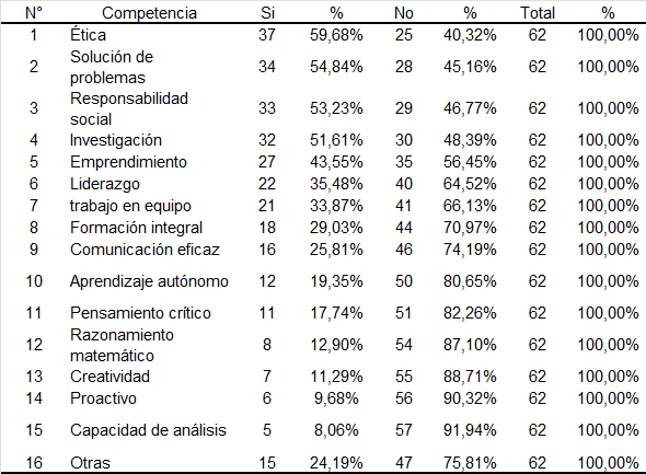 Igualmente se concluye que la competencia genérica que las universidades han incorporado, mayormente, más en sus perfiles de egreso es la ética, la cual es muy requerida por los empleadores, seguida en un orden descendente de las competencias de solución de problemas, responsabilidad social e investigación.