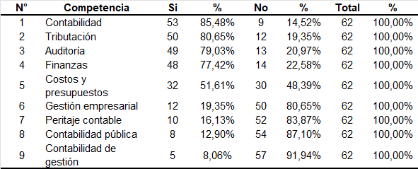 Como resultado del análisis se identificaron 9 competencias que se repetían con frecuencia en los perfiles revisados, las cuales han sido presentadas por separado en la Tabla 3, indicando en cuántos perfiles del egresado aparecen. La competencia que tiene mayor presencia en los perfiles del egresado de la muestra corresponde a Contabilidad, con una frecuencia de 53 veces (equivalente a 85.48 %), seguida de Tributación, con una frecuencia de 50 veces (equivalente a 80.65 %). Asimismo, la competencia Auditoría apareció 49 veces y la de Finanzas 48 veces (con una participación de 79.03 % y 77.42 %, respectivamente). En el caso de la competencia Costos y presupuestos, esta aparece 32 veces, con una participación de 51.61 %.