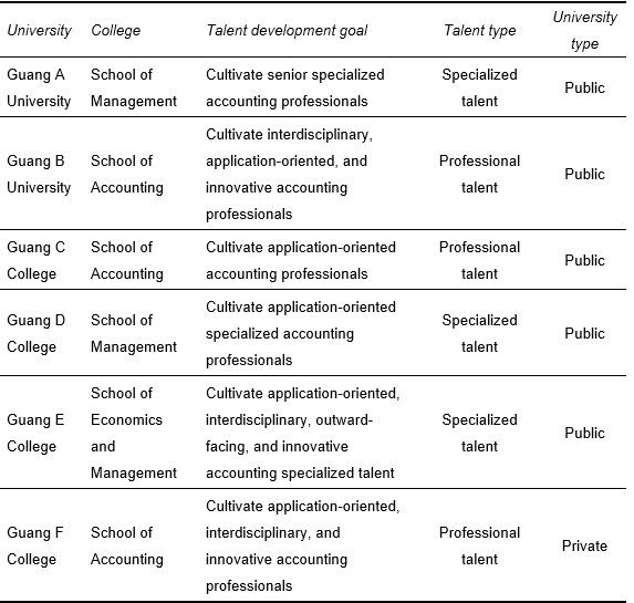 Among the six universities, three focus on cultivating "specialized talent," while the other three focus on "professional talent" (as shown in Table 2).