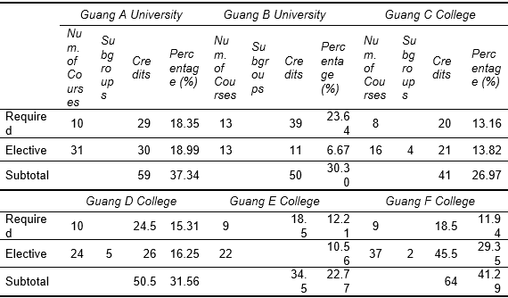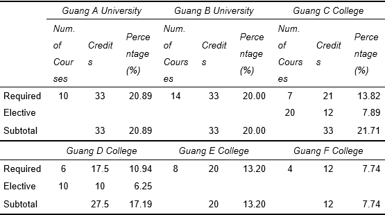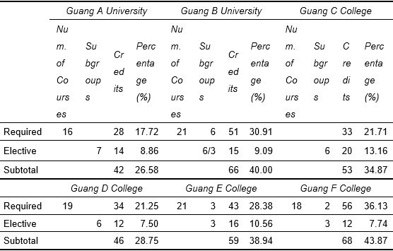 Guang A University and Guang B University each offer 10 courses (33 credits) and 14 courses (33 credits), respectively, with the former accounting for 20.89% and the latter 20.00% of the total required graduation credits. In contrast, Guang F College plans only 4 courses (12 credits, or 7.74%) in this module.