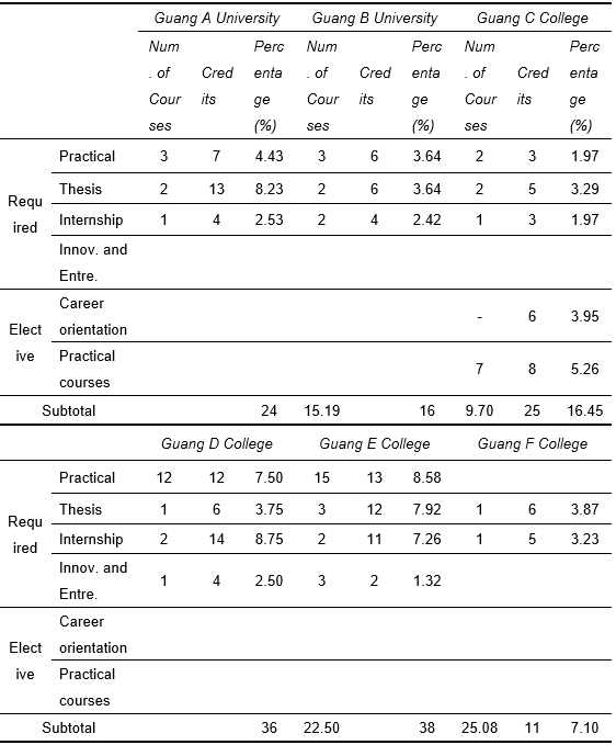 Practical courses are generally divided into several categories, including practical courses, thesis courses, internship courses, innovation and entrepreneurship courses, and career-oriented courses. As shown in Table 7, Guang E College (25.08%) and Guang D College (22.50%) have a higher proportion of practical courses (over 20%), while Guang F College (7.10%) and Guang B University (9.70%) have a lower proportion. Guang E College offers 15 practical courses (8.58%), seven of which are coordinated with theoretical courses, such as Cost Accounting Experiment in conjunction with Cost Accounting, Management Accounting Experiment with Management Accounting, and Financial Management Experiment with Financial Management. The thesis module requires 12 credits (7.92%) and includes courses such as Yearly Thesis I, Yearly Thesis II, and Graduation Thesis. The internship module requires 11 credits (7.26%), with courses such as Professional Internship and Graduation Internship. In contrast, Guang F College offers only thesis (3.87%) and internship (3.23%) courses. Overall, Guang E College and Guang D College place a stronger emphasis on practical courses compared to the other four universities.