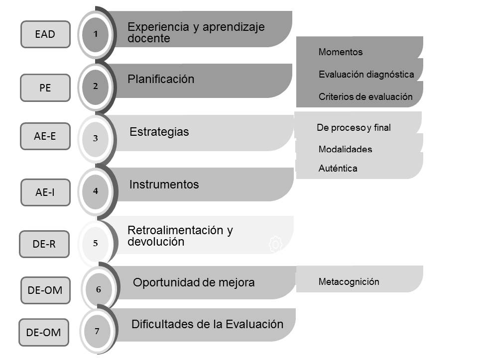 Las categorías de análisis que emergieron del discurso de los docentes fueron las que se consideraron predeterminadas y se agregó una más como la experiencia y aprendizaje docente en la evaluación además de otras consideradas como sub-categorías como se observa en la figura 1.