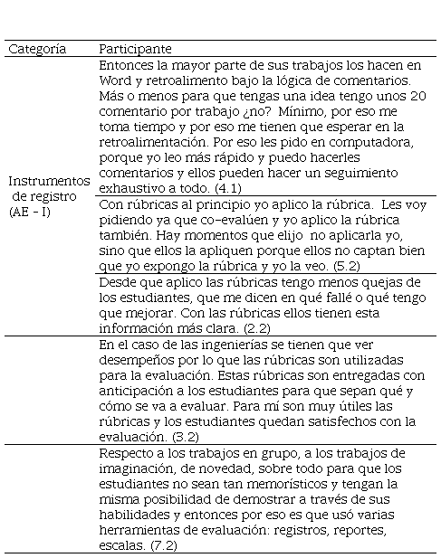 Los instrumentos no se mencionan mucho por parte de los docentes, entre los más identificados están las anotaciones en los mismos trabajos, la retroalimentación de los criterios de evaluación se escriben a cada estudiante.