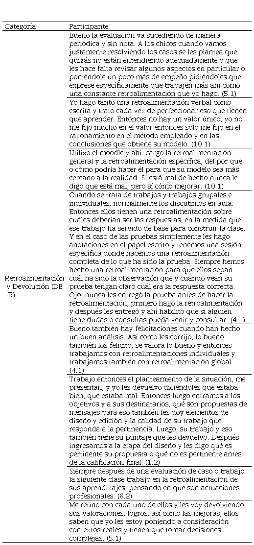 La retroalimentación, así como la devolución de la evaluación es otro de los temas en los que más se explayan los docentes, mencionando modalidades, estrategias y sentidos para sus asignaturas que hacen con la retroalimentación. La retroalimentación también muestra el tipo de comunicación que tienen con los estudiantes y la dinámica de intervención en el proceso de enseñanza aprendizaje. En todos los casos consideran a la retroalimentación como un ejercicio de la práctica formativa pero cada uno con abordaje distinto. Aspecto que muestra un gran cambio en la formación basada en competencias, porque el fin último es que el estudiante se apropie de la misma.