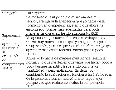 Se remarca que varios docentes entrevistados mencionaron la evolución que han tenido con el tiempo en su práctica de evaluación de aprendizajes dentro de este enfoque, que antes su accionar era más teórico y que ahora ya se sienten más estratégicos al gestionarla. Aspecto que muestra la importancia de la experiencia como factor regulador en la aplicación de la misma.