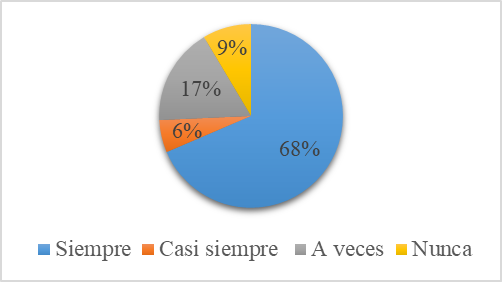 La motivación del docente de Física hacia el gusto por las clases de esta asignatura se diferencia en este estudio, el 68% de los estudiantes consideran que el docente siempre está empleando técnicas motivacionales, el 6% indicaron casi siempre, el 17% a veces y solo un 9% opinaron nunca. De acuerdo a los resultados se evidencia que el docente de Física constantemente está motivando al estudiando, para que a éstos les gusten los contenidos que se estén desarrollando en esta asignatura. Pero, para lograr una mayor motivación es indispensable emplear actividades nuevas, en vez de repetir las mismas en varias ocasiones, siendo trabajo del docente en su totalidad (García de las Bayonas & Baena 2017).