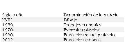 En la tabla anterior presentamos los cambios que ha sufrido el concepto de educación del arte. En el siglo XVIII, la educación artística básicamente estaba centrada en el dibujo y lo que este abarca, del cual recoge el nombre de la asignatura. Años más tarde, coincidiendo con el final de la Guerra Civil y la entrada en la dictadura, hubo una reforma en los planes de estudio de la educación, incorporando la materia de trabajos manuales en la sección femenina, siendo ésta la representación de la educación artística de la época. Aludiendo a las manualidades como arte. No es hasta 1970, con la aprobación de Ley General de Educación, cuando adquiere el término de expresión plástica, añadiendo contenidos específicos a su temario, los cuales no se habían tenido en cuenta en épocas anteriores. Es a partir de la LOGSE cuando la materia de educación artística comienza a adquirir nuevos valores, modificando su nombre hasta encontrar el término que se identifique con el contenido que ésta aborda.