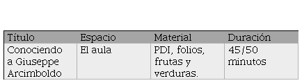 Desarrollo: La sesión contará con una actividad de motivación en la que presentaremos al artista Giuseppe Arcimboldo, veremos algunas de sus obras más famosas y trataremos de identificar qué productos de los que utiliza se venden en el mercado. Acto seguido, cada alumno realizará una representación de un rostro utilizando la técnica del artista Arcimboldo, es decir, compuesto por recortes de frutas y verduras físicas.