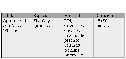 Desarrollo: Para esta sesión necesitaremos la colaboración de las familias, a las que se les pedirá previamente que guarden y recojan los envases de los diferentes productos que solemos gastar vinculados con el mercado. Para iniciar la clase, visualizaremos una foto del artista Andy Wharholl, explicaremos quién es y mostraremos algunas de sus obras más importantes relacionadas con el mercado y el consumismo. A continuación, cada niño mostrará a los demás los envases que ha recogido de casa, y observaremos cuáles son los que más se consumen y nuestros favoritos. Por último, en el gimnasio crearemos una instalación artística con los envases aportados por cada alumno. Posteriormente, podremos interactuar y experimentar sensaciones sensoriales, ya que disponemos de diferentes texturas, colores, formas e incluso olores que quedan impregnados en los embalajes. Podrán realizarse diferentes recorridos, por ejemplo: tocar sólo con las manos u otro con los pies. Los diferentes productos, estarían clasificados según la tienda dónde se pueden vender.