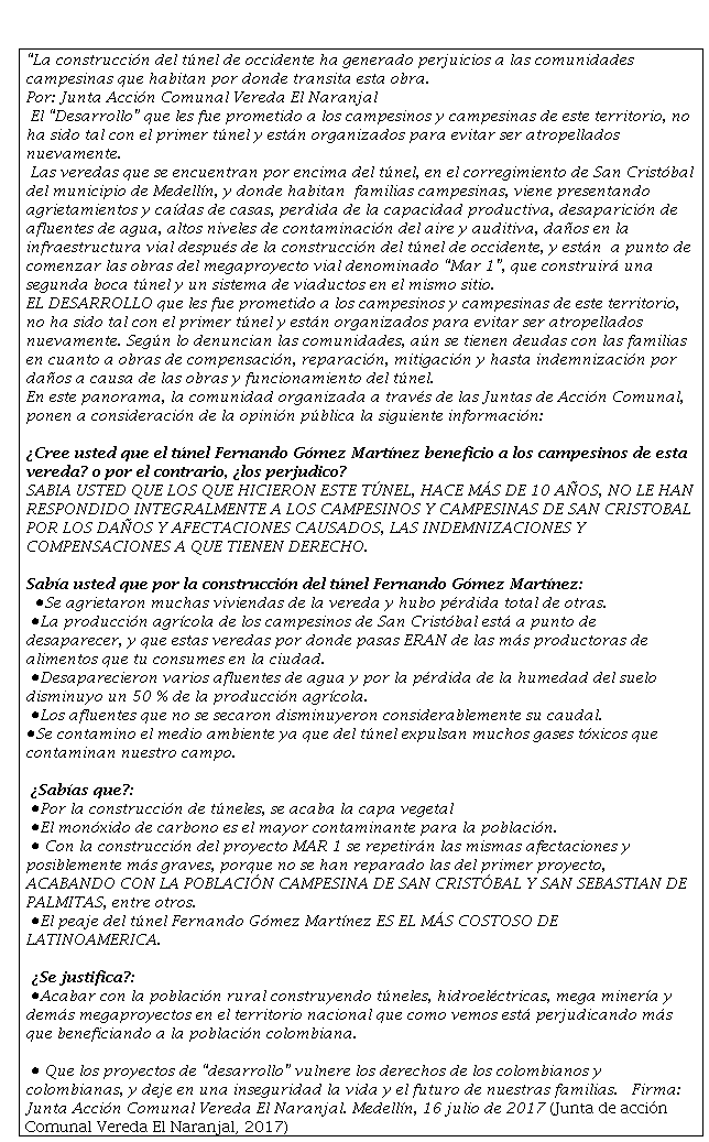 En el presente texto, presentaremos el caso de la Vereda El Naranjal, del corregimiento de San Cristobal, de la ciudad de Medellín (Colombia) una comunidad de 74 familias, campesinas, cultivadoras, afectada en distintos momentos, por la construcción del Túnel Juan Gómez Martínez y luego, en la misma zona, la construcción de un segundo Túnel de conexión hacia el Occidente Colombiano, la zona del Urabá antioqueño.