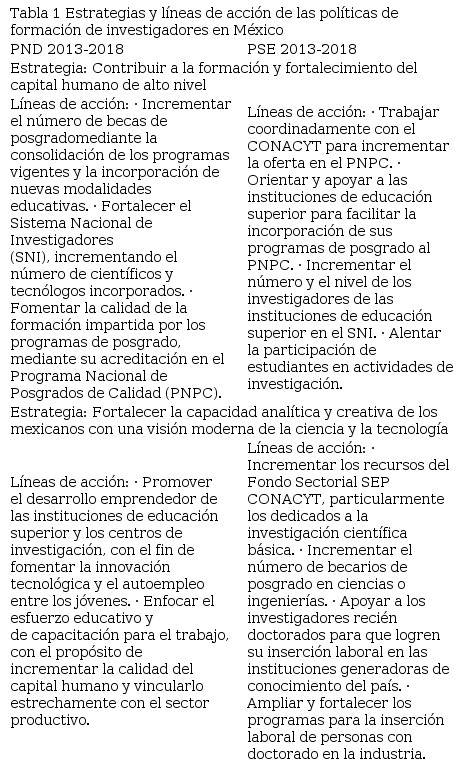 Sin embargo, en el diagnóstico presentado en el PND 2013-2018 se observan serias carencias en materia de desarrollo de la investigación. México se encuentra entre los países con menor contribución a la producción del conocimiento, reportando menos del 1% del total alcanzado a nivel mundial; la formación de posgrado ?en términos específicos de estudios doctorales concluidos? mantiene una proporción de 29.9 doctores graduados repartidos en las diferentes líneas de investigación desarrolladas en el país por cada millón de habitantes ( Gobierno de la República, 2013; Secretaría de Educación Pública, 2013). Con la intención de contrarrestar esta insuficiencia, tanto en el PND como en el Programa Sectorial de Educación (PSE) 2013-2018 se plasman los objetivos, estrategias y líneas de acción para desarrollar la investigación en México.