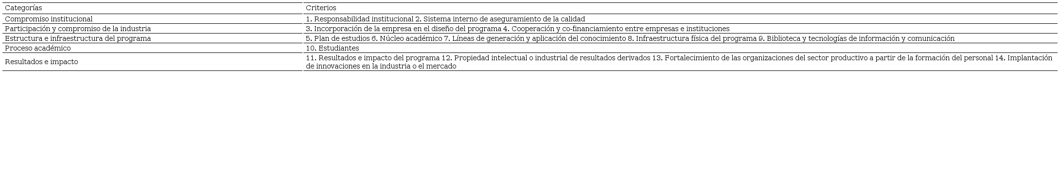 En cuanto a la acreditación de la calidad de los programas educativos, todos los posgrados de calidad registrados en México en el PNPC se someten al modelo de evaluación que contempla el CONACYT, el cual sufre ligeras modificaciones de acuerdo con la modalidad educativa. Para el caso de los ?posgrados con la industria? el modelo comprende cinco categorías y 14 criterios (ver tabla 2).