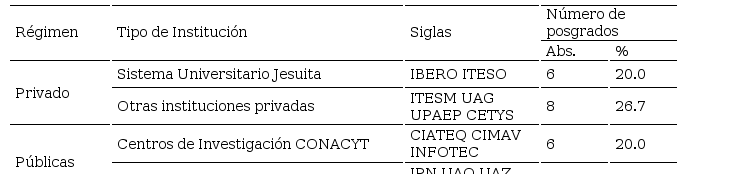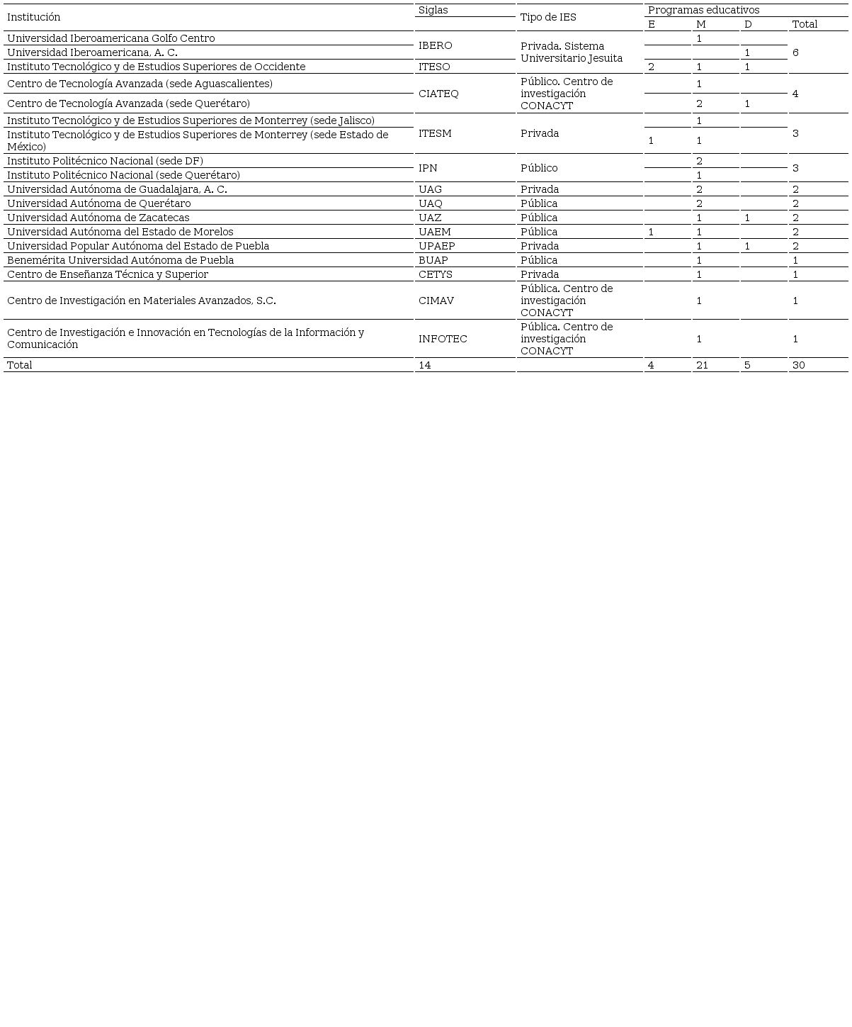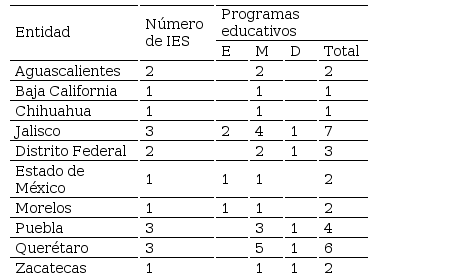 En este último caso se encuentra el IPN que ofrece tres programas en sus sedes del Distrito Federal (hoy Ciudad de México) y Querétaro; el ITESM que ofrece cuatro programas en sus sedes del Estado de México y Jalisco; el CIATEQ con cuatro posgrados ofrecidos en sus sedes de Aguascalientes y Querétaro y el Sistema Universitario Jesuita que, en este caso, integra dos planteles de la IBERO y el ITESO para ofrecer seis posgrados. El único plantel cuya oferta llega a cuatro posgrados es el ITESO.