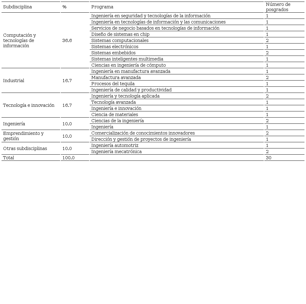 De los 39 posgrados registrados, 30 se ubican en el área de Ingeniería y los demás se distribuyen de la siguiente manera: tres en Biotecnología y ciencias agropecuarias, uno en Humanidades y ciencias de la conducta, uno en Medicina y ciencias de la salud y uno en Ciencias sociales.