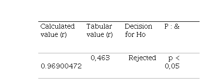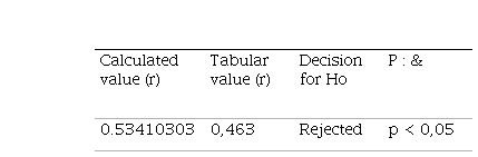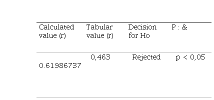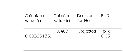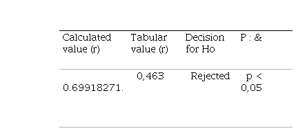 After performing the respective calculations, an r value equal to 0.96900472 was found, which is greater than the tabular value equal to 0.463 obtained taking into account 30 degrees of freedom and a significance level of 0.05. With this result, the null hypothesis is rejected; that is, the research hypothesis is fulfilled to the extent that the value found is in the respective interval of the r values according to the table of critical values for Pearson's correlation coefficient (r) where Ho: p < 0.