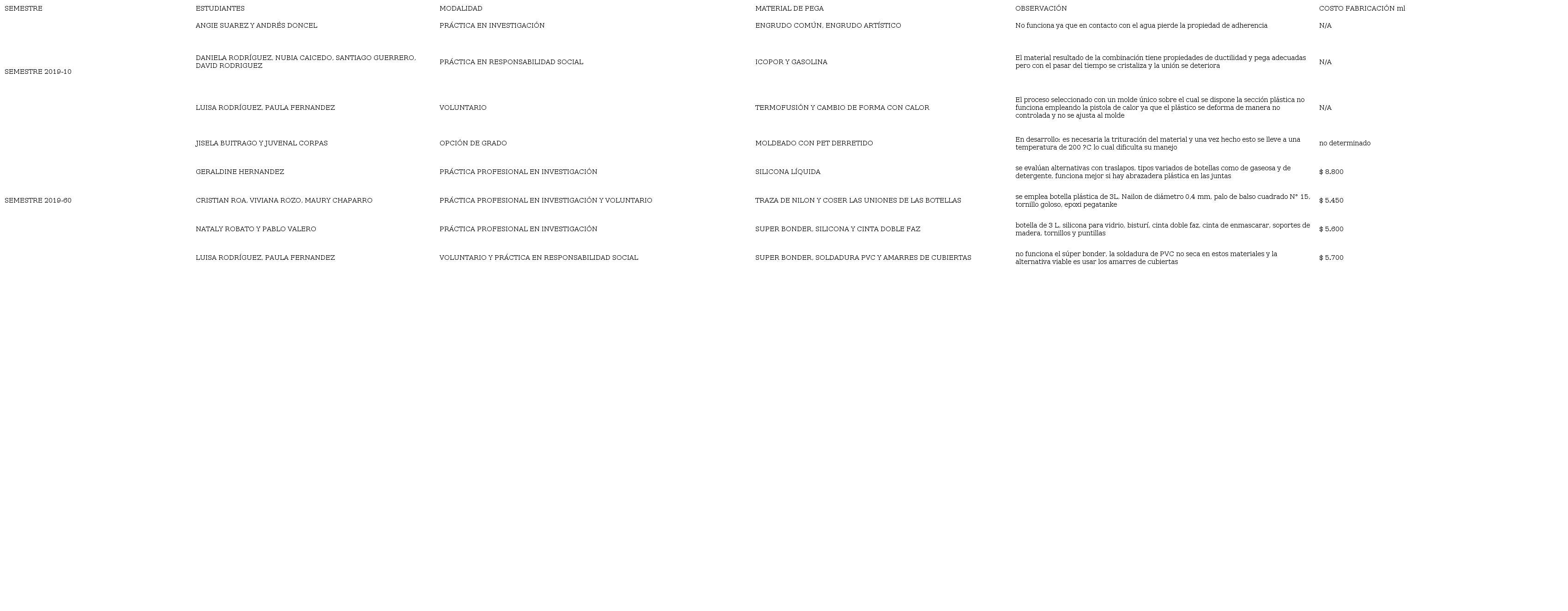 El método evaluativo de los materiales de pega desarrollados en el primer semestre de 2019 por los estudiantes del programa de ingeniería civil permitió descartar muchos de éstos debido a que se sometieron a pruebas de resistencia en períodos largos de tiempo y no funcionaron adecuadamente en condiciones de intemperie lo cual conlleva a seguir valorando las alternativas medidas con costos de fabricación para así determinar en mejor medida su relación de costo beneficio.