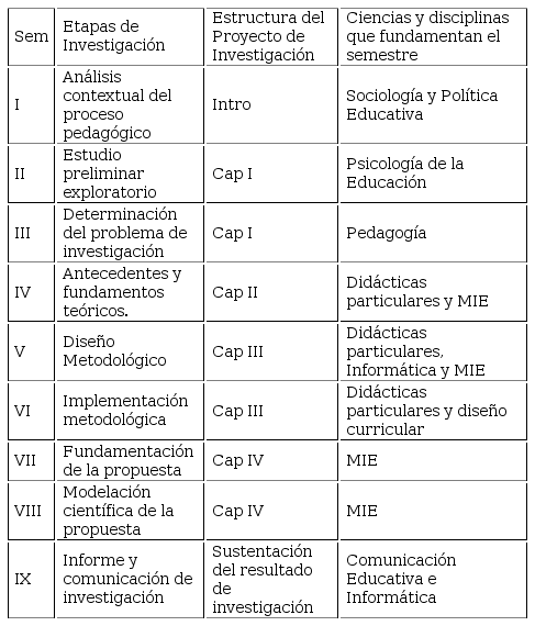 La titulación no es una unidad curricular vinculada a una parte del currículo, sino un campo de formación del todo diseñado desde los primeros semestres o una integración de los campos formativos, mediante el cual se dirigen el accionar de docentes y estudiantes para el alcance de la culminación de estudios. En lo anterior deben considerarse para su modelación tres aspectos esenciales: las etapas de la investigación educativa, la estructura del proyecto de investigación y las ciencias y disciplinas que fundamentan el semestre (Tabla 1).