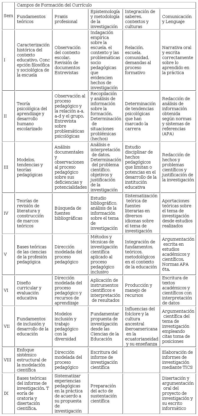 El desarrollo de aprendizajes y desempeños pedagógicos en carreras de Ciencias de la Educación debe enfocarse en la horizontalidad del currículo desde los campos de formación, a través de los semestres, lo cual permitirá ir ascendiendo desde lo simple a lo complejo del saber pedagógico, como dijeran (Milanés Gómez, Rodríguez Morales, y Ávila Portuondo, 2016, pág. 110) no solo reducido al último año de la carrera o la obtención del diploma de graduado, sino a la transversalidad formativa del currículum y las asignaturas que tributen desde una visión integradora a la formación de competencias investigativas de los graduados.