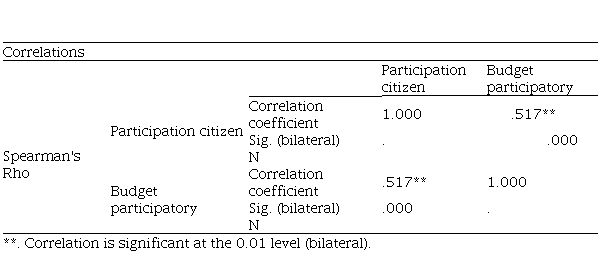 It was determined that there is a moderate and positive correlation with a correlation value of Spearman's Rho = 0.517 and p = 0.000<0.01, between the variables citizen participation and participatory budget in the district and provincial municipalities of Peru. This indicates that the greater the citizen participation, the better the participatory budget processes are developed.
