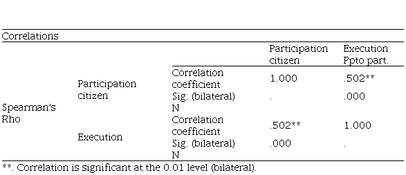 It was determined that there is a moderate and positive correlation with a correlation value of Spearman's Rho = 0.502 and p = 0.000<0.01 between citizen participation and the execution of the participatory budget in the district and provincial municipalities of Peru. This indicates that the greater the citizen participation, the better the execution of the participatory budget.