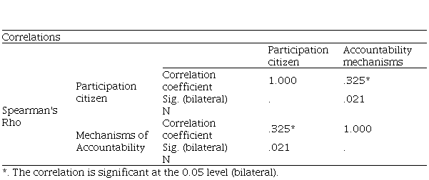 It was determined that there is a moderate and positive correlation with a correlation value of Spearman's Rho = 0.325 and p = 0.021<0.05 between citizen participation and accountability mechanisms in district and provincial municipalities in Peru. This indicates that the greater the citizen participation, the better the accountability mechanisms of the participatory budget work.