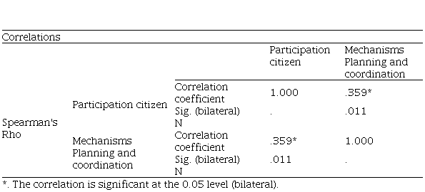 It was determined that there is a moderate and positive correlation with a correlation value of Spearman's Rho = 0.359 and p = 0.011<0.05 between citizen participation and participatory budget planning and coordination mechanisms in district and provincial municipalities in Peru. This indicates that the greater the citizen participation, the better the participatory budget planning and coordination mechanisms work.
