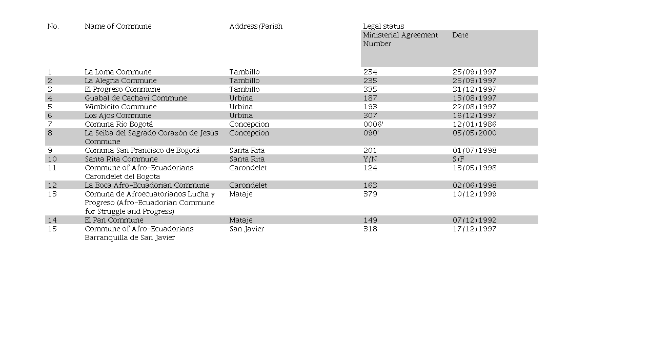 This study focuses exclusively on the fifteen ancestral communities located in the San Lorenzo canton of the province of Esmeraldas, which have acquired legal existence and legal status from the National Agrarian Authority (Ministry of Agriculture and Livestock).
