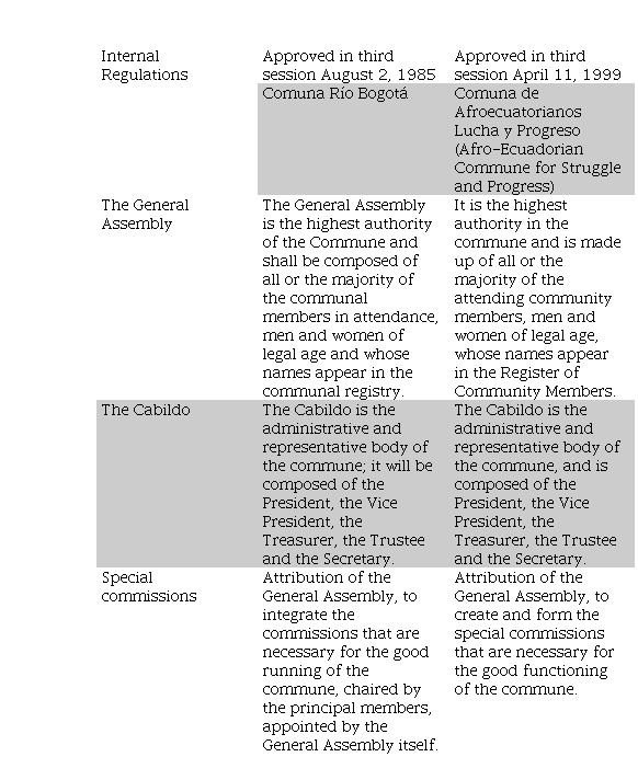 Table 1 shows a comparison of the administrative bodies of two ancestral communes of San Lorenzo canton, between 1985 and 1999, which are included in their respective internal regulations, in order to identify how they are integrated and whether there have been any changes or modifications.