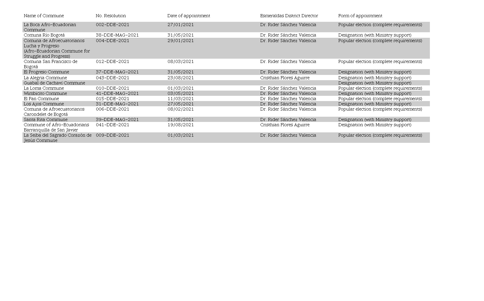 Once elected, which will take place on any day of the month of December of each year, by popular election or designation by the Ministry of Agriculture and Livestock, the appointment of the cabildo will stipulate that their functions must be exercised for one year, starting on January 1. Table 2 shows for each ancestral commune located in the San Lorenzo canton, the numbers of administrative resolutions, dates of issuance of the appointments, district director who signed the resolution, and form of appointment.