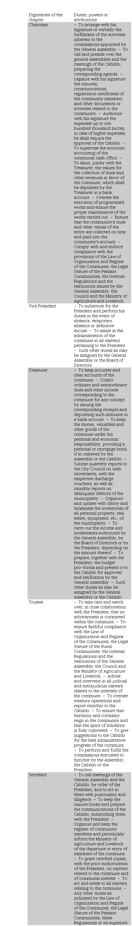 In these circumstances, the law clearly defines and assigns the duties, attributions and competencies that must be fulfilled by those who make up the official, representative and executing body of the communes; in which case, they must comply with and enforce the provisions of the Constitution of the Republic of Ecuador, the Law of Organization and Regime of the Communes, the Legal Statute of the Rural Communities, the Internal Regulations; Election Regulations; and other resolutions adopted by the Ministry of Agriculture and Livestock or the pertinent authority.