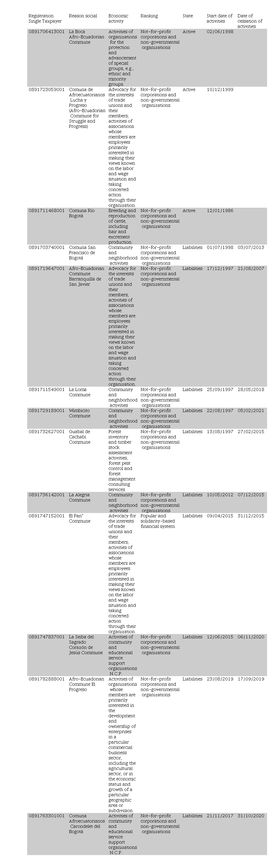 The ancestral communities, having legal existence and legal status, are obliged to register their economic activities with the Internal Revenue Service, constituted as private companies, obliged to keep accounts, classified as non-governmental non-profit organizations or in the popular and solidarity financial system; of the fifteen ancestral communities in San Lorenzo canton, only thirteen have obtained the RUC (Registro Único de Contribuyentes), under the following considerations, see table 3.