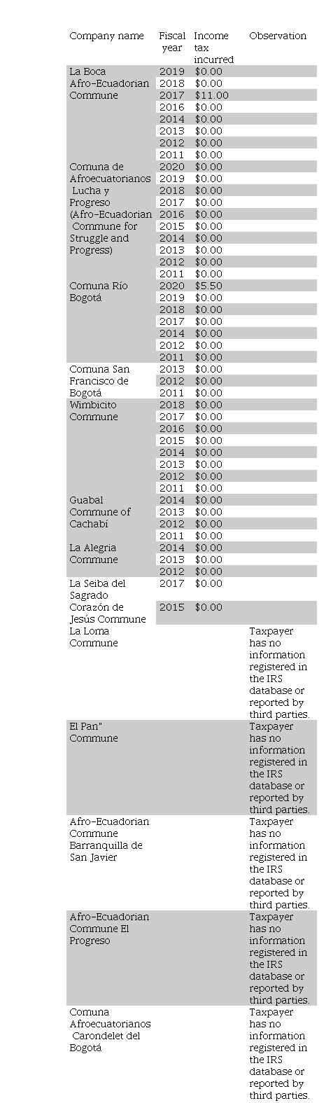 Table 4 shows the information reported by the ancestral communes of San Lorenzo canton to the Internal Revenue Service for income tax incurred in the last 10 years.