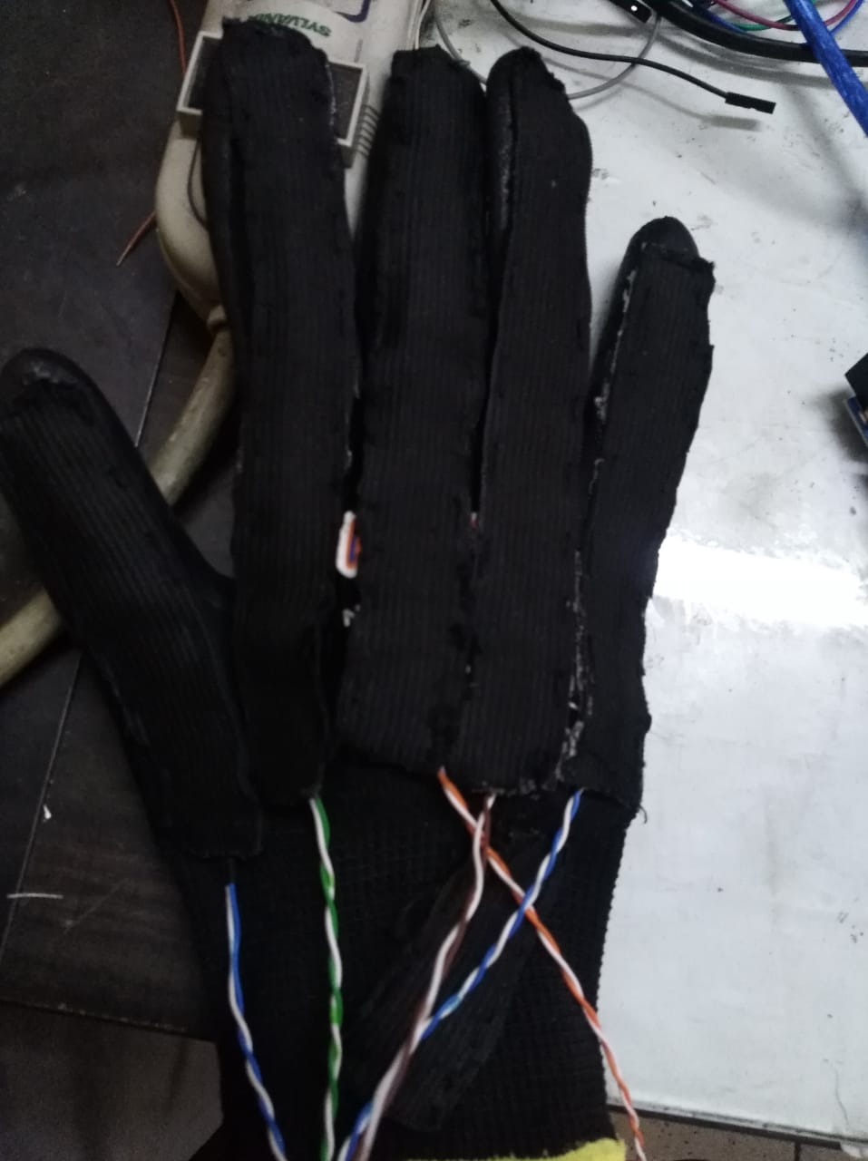 Los sensores funcionan ejerciendo una resistencia eléctrica al momento de ser doblados, y dependiendo del ángulo en el que se encuentre, dan diferentes valores, los cuales se capturan para luego a la combinación de resultados asignarles las letras del abecedario. Así, la figura 3 muestra la vista final del guante.