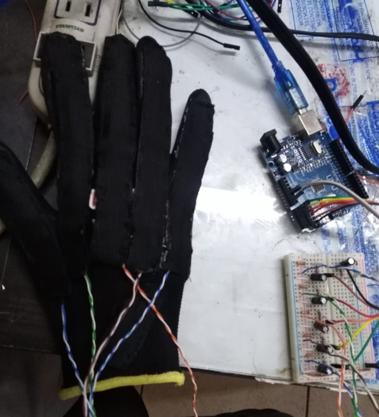 En la Figura 2 se aprecia cómo se encuentra montado el circuito del guante, los sensores se encuentran ubicados en cada dedo y en la muñeca. Estos se conectan a un Arduino UNO a través de una protoboard, a su vez, las conexiones son alimentadas por la misma placa Arduino.
