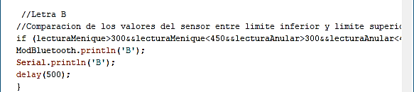 Finalmente, en el ejemplo mostrado en la Figura 4, se cambian los valores de cada sensor dependiendo de la letra que se esté calibrando. Se utiliza dos valores como rangos en los cuales el Arduino interpreta como una letra.