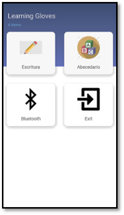 La aplicación diseñada para el sistema operativo Android (Figura 5) muestra diferentes opciones para complementar el funcionamiento del guante. Primero, para poder conectarlo se necesita tener activado en el smartphone la tecnología Bluetooth. Luego se selecciona el dispositivo para emparejarlos y desde ese momento se podrá visualizar las acciones del guante con el celular desde el apartado de escritura.
