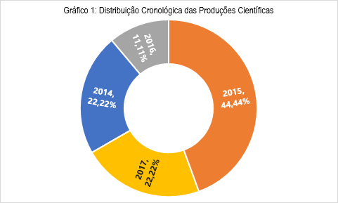 A distribuição cronológica das publicações pesquisadas foi relativamente equilibrada, principalmente em 2014 e 2017, conforme nos mostra o Gráfico 1.