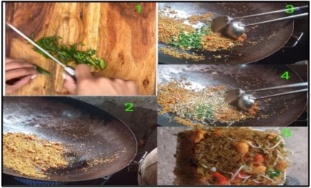 P. Primero teñimos el arroz con salsa de soya y lo cocinamos, segundo, se deja reposar 20 minutos, tercero, se tira en la paila (vasija grande de metal, redonda y poca profunda), se le agrega un cucharón de aceite, dos cucharadas de sal, un puñado de cebolla en rama que son 20 gramos y un puñado de raíces chinas que también son 20 gramos (ver Figura 5)