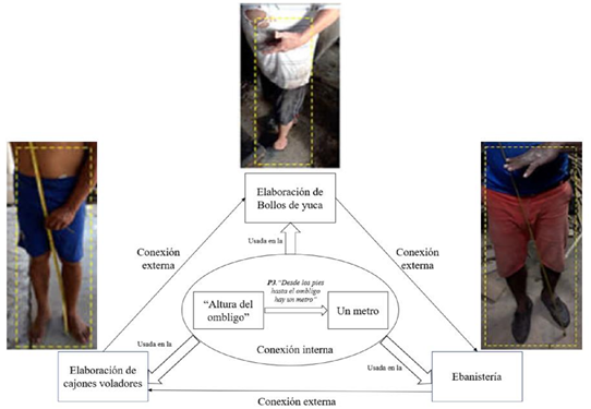 Además, la conexión de significado etnomatemático se identifica cuando una persona atribuye un sentido a un concepto matemático u objeto haciendo una relación de expresióncontenido, emitiendo lo que significa para él un objeto cultural o artefacto, una medida, un diseño, entre otras actividades universales, en función de la práctica cotidiana (RODRÍGUEZ-NIETO, 2020). Por ejemplo, en la Figura 1 se presentan las conexiones internas y externas realizadas por personas que elaboran bollos, muebles y cajones (prácticas diferentes – conexión externa) y usan de manera similar una medida de la altura del ombligo equivalente a un metro (conexión interna).